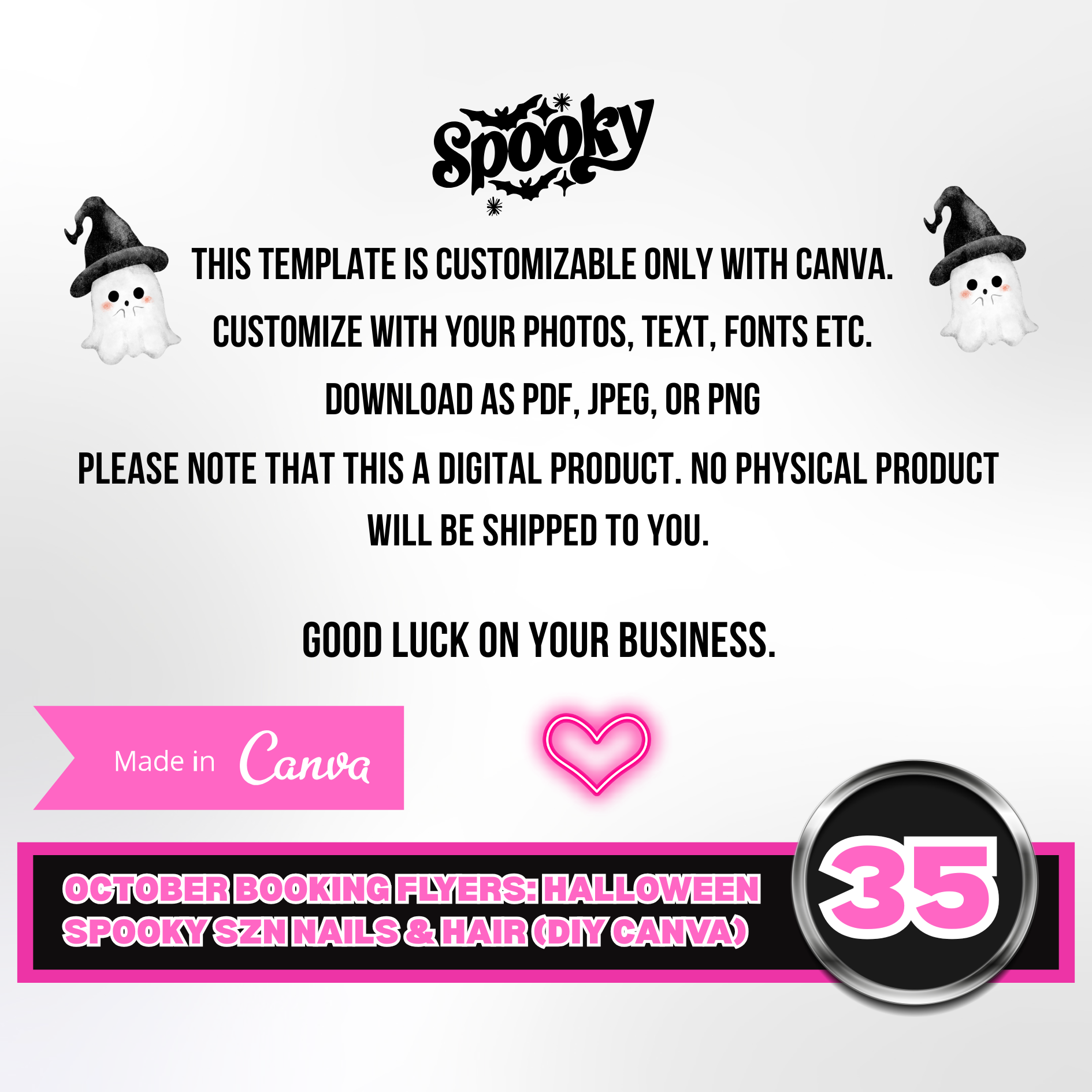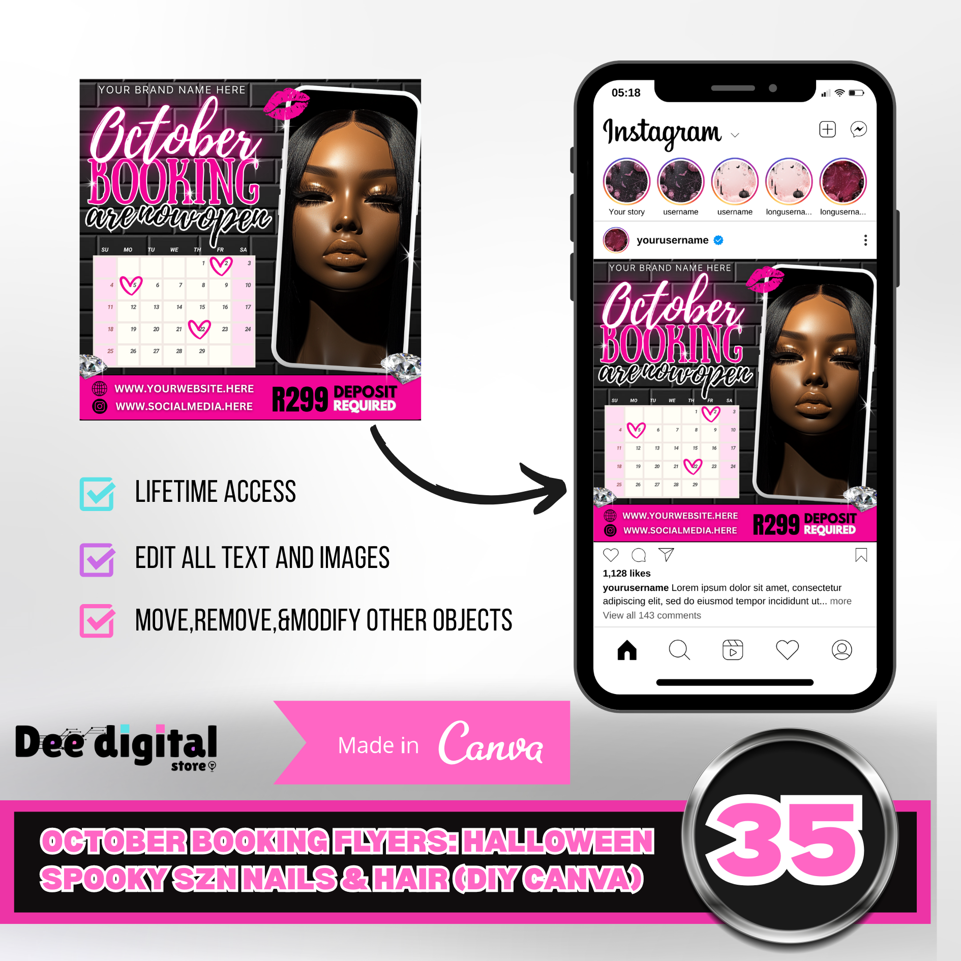 35 editable flyer templates (size 1080x1080px) & 1 PDF with a link to access and edit your Canva template
